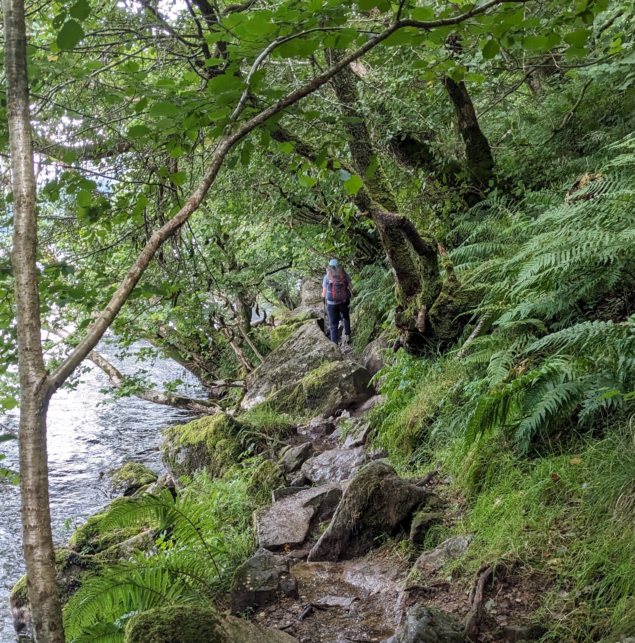 I was expecting the WHW to be more open on highlands than it has been so far. Today's trail all along the east shore of Lac Lomond was extremely rocky and slow in a tight forest and much of yesterday was in forest as well. Lots of scrambling over big rocks today rather than walking, much left over mud and water from yesterday, but it wasn't raining.