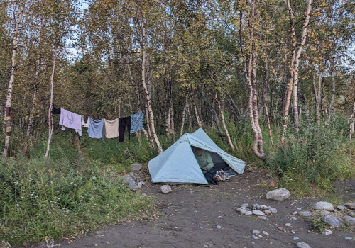 After another 3 miles or so, we found ourselves out on the barren tundra with no one around and beautiful views in all directions. We set up our new tent, filtered water from a small pond, hung wet clothes to dry, and made shepherd's pie for dinner. At 9:00, we were all cleaned up and settled into our tent and it was still light out. Since we are in the land of the midnight sun above the Arctic Circle, it never gets completely dark at night this time of year. We'll be losing many minutes of daylight each day as the summer winds down.